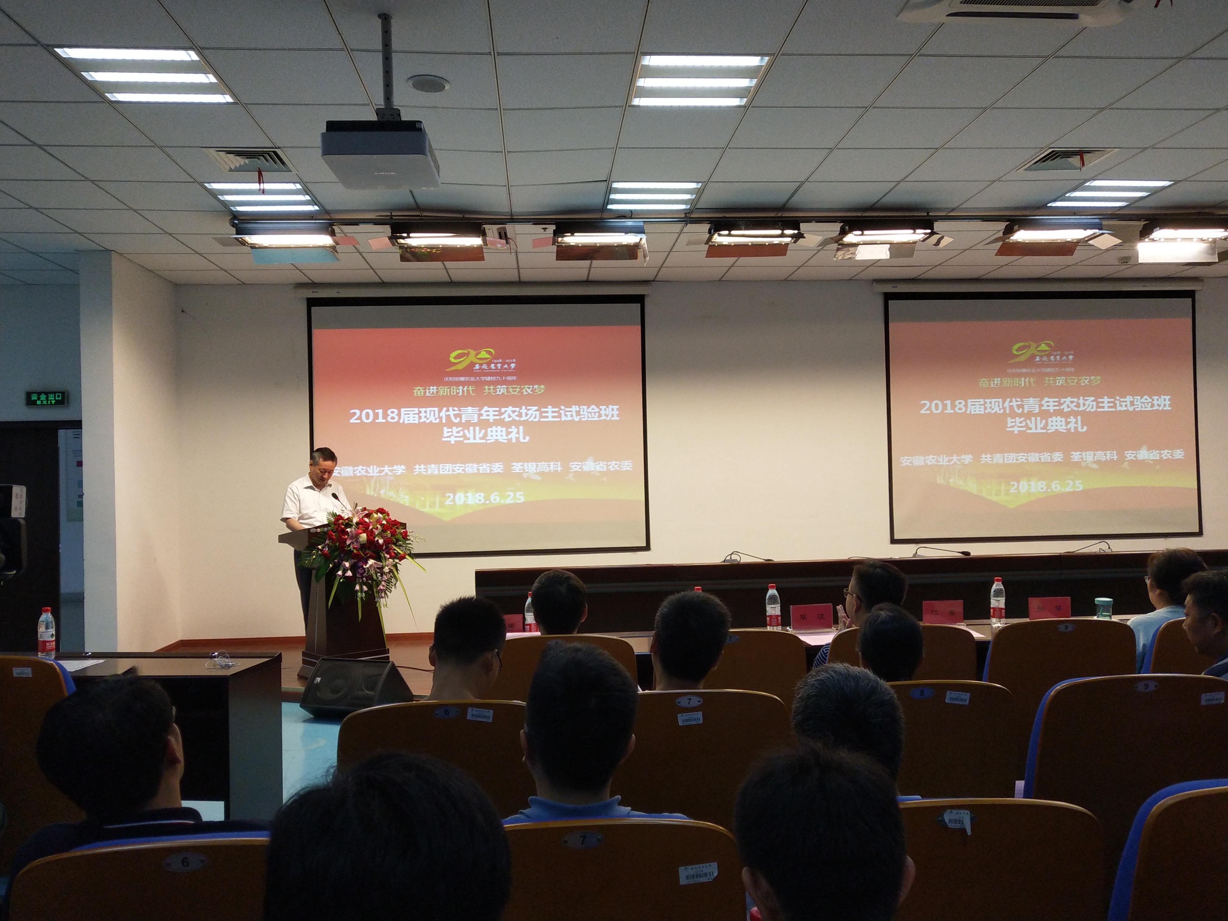 ??? 2018年6月25日上午,2018屆團校企“現(xiàn)代青年農場主”荃銀創(chuàng)新創(chuàng)業(yè)試驗班畢業(yè)典禮在安徽農業(yè)大學舉行。安徽農業(yè)大學黨委書記江春,共青團安徽省委員會副書記李波、荃銀高科董事長張琴出席畢業(yè)典禮。安徽農業(yè)大學副校長馬傳喜主持畢業(yè)典禮。巽風湖創(chuàng)業(yè)孵化基地總經理佘良東、荃銀高科定遠創(chuàng)業(yè)孵化基地負責人羅干以及安徽農業(yè)大學相關處室、學院等單位主要負責人、部分現(xiàn)代青年農場主試驗班的任課老師、2018屆現(xiàn)代青年農場主試驗班畢業(yè)生、2015級和部分2016級現(xiàn)代青年農場主試驗班學員參加了畢業(yè)典禮。
